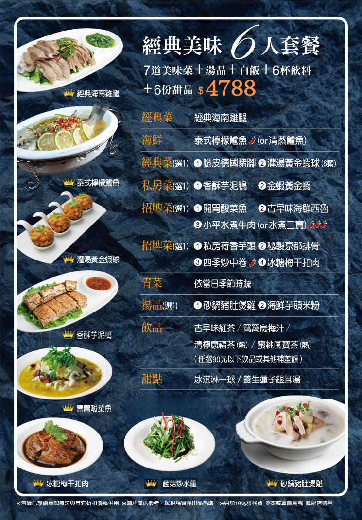 6人套餐 $4788|7道美味菜+湯品+白飯+6杯飲料+6份甜品