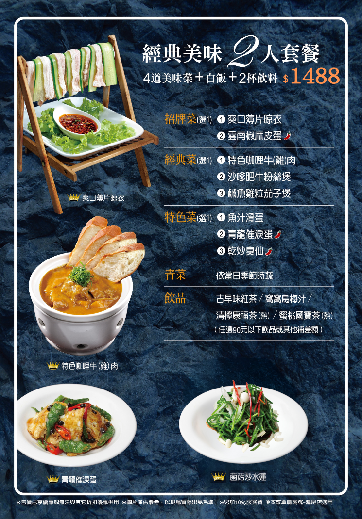2人套餐 $1488|4道美味菜+白飯+2杯飲料